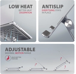 Ciesz się wygodnym środowiskiem pracy z kompaktowym i przenośnym stojakiem, który sprosta Twoim potrzebom, niezależnie od tego, czy pracujesz w domu, w biurze, czy w podróży. Ten stojak jest wykonany z trwałych odlewów aluminium, które zapewniają jego długowieczność i niezawodność. Dzięki antypoślizgowemu wykończeniu powierzchni nie musisz obawiać się niepożądanych ruchów; Twoje urządzenie będzie pewnie trzymać się na swoim miejscu, nie uszkadzając powierzchni laptopa czy podkładki.