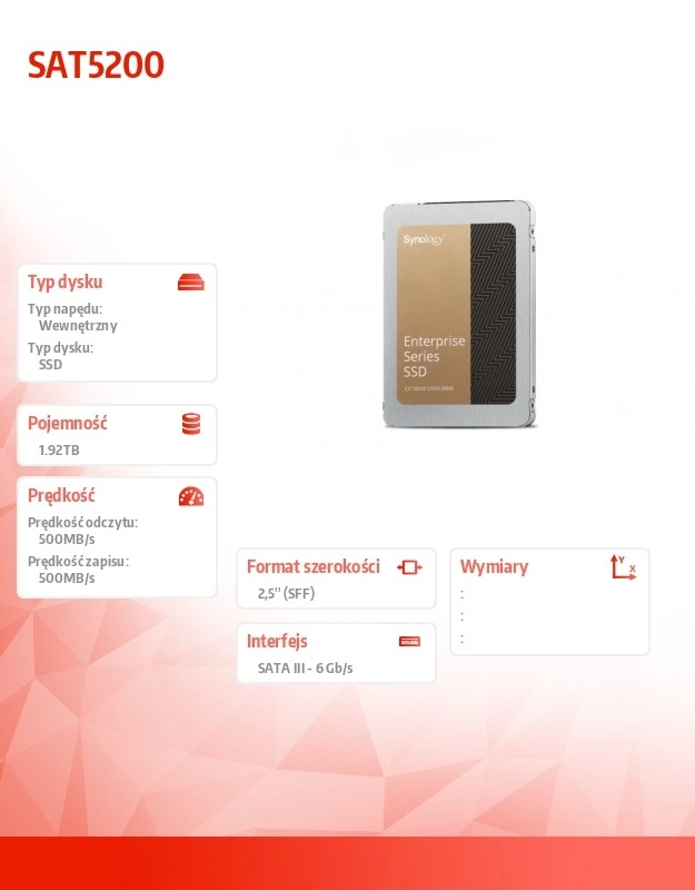 Smukła konstrukcja 2,5" / 7 mm i interfejs SATA 6 Gb/s zapewniają szeroką kompatybilność w serwerach i macierzach. Jeśli szukasz niezawodnego firmowego SSD do NAS Synology, SAT5200 1,92 TB to wydajny i bezpieczny wybór.