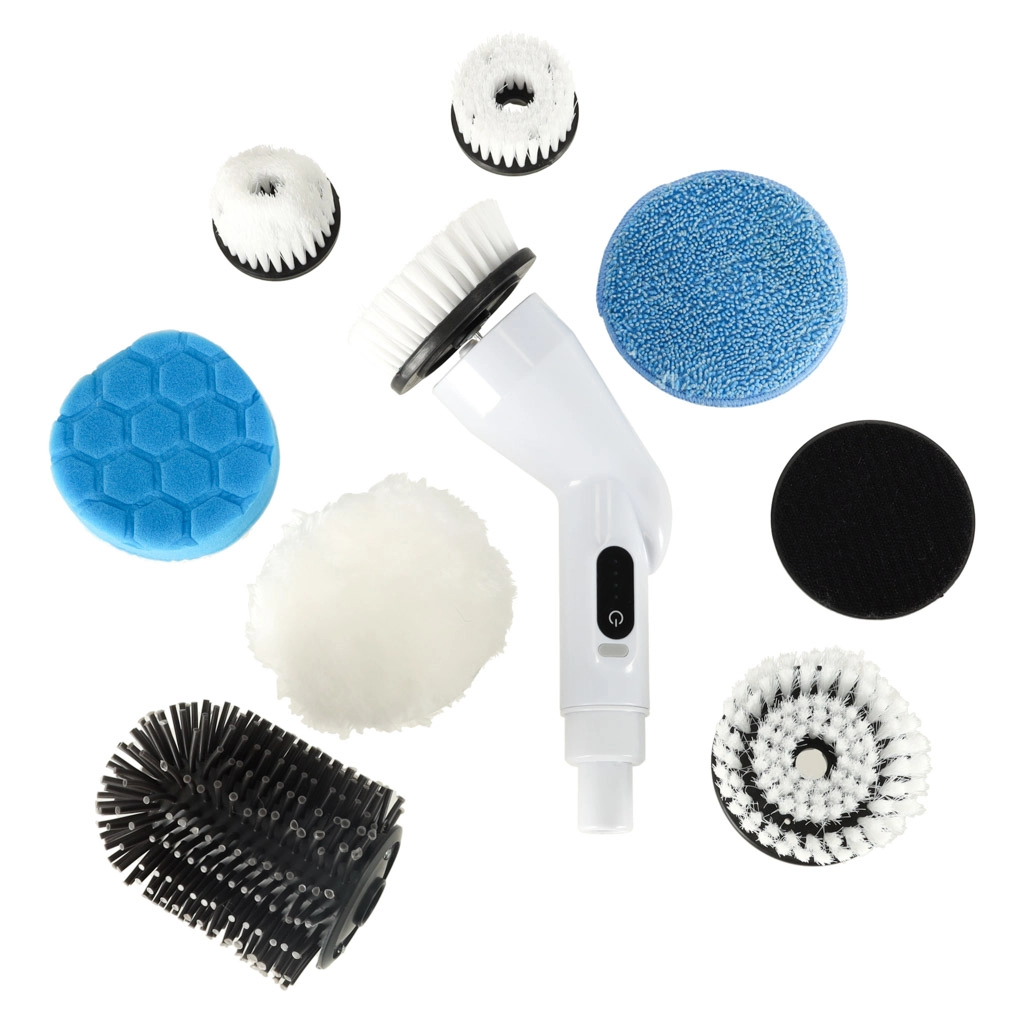 Wymienne głowice obejmują szczotki, gąbki i pady polerskie do różnych powierzchni – płytek, fug, wanien, zlewów, szkła i płyt grzewczych. Wbudowany akumulator 3,7 V / 2000 mAh zapewnia do 30 minut pracy na jednym ładowaniu i łatwo naładujesz go przez kabel USB.