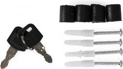 W zestawie znajdują się elementy montażowe, w tym cztery kołki i podkładki dystansowe, co umożliwia natychmiastową instalację po rozpakowaniu. Skrzynka zawiera dwa klucze dla zwiększonego bezpieczeństwa.