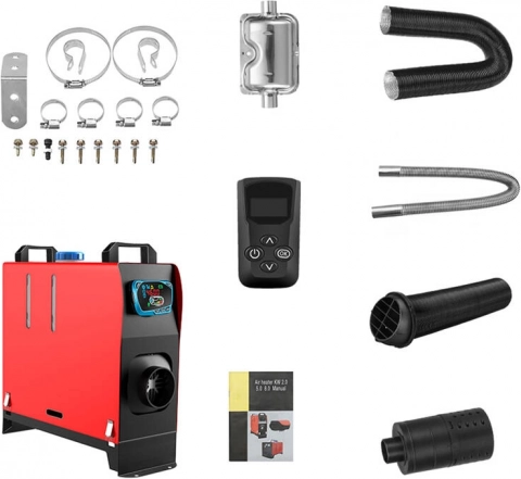 - Nagrzewnica, pilot, przewody dolotowe i wydechowe, tłumik wydechu, filtr powietrza, akcesoria montażowe, uchwyt, opaski montażowe, instrukcja