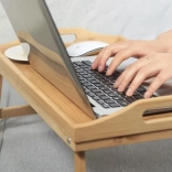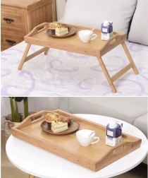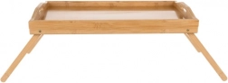 Powierzchnia z naturalnego bambusa jest gładka, łatwa w czyszczeniu i nie pochłania zapachów. Podwyższone krawędzie i praktyczne boczne uchwyty ułatwiają przenoszenie i zapobiegają zsuwaniu się przedmiotów. Po użyciu wystarczy złożyć nogi i odłożyć stolik do szafy, pod łóżko lub za sofę.