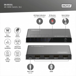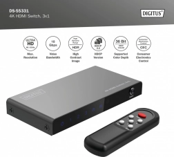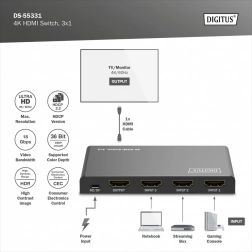 Koniec z ciągłym przepinaniem kabli. Kompaktowy przełącznik DIGITUS 4K HDMI 3×1 elegancko rozszerzy Twoje urządzenia o trzy pełnoprawne wejścia HDMI. Dzięki obsłudze Ultra HD 4K przy 60 Hz i HDCP 2.3 zyskasz ostry obraz i płynne odtwarzanie z konsol do gier, dekoderów, laptopów czy odtwarzaczy.