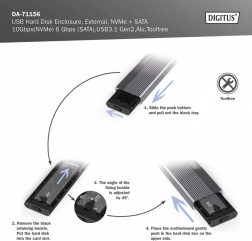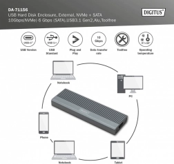 Uniwersalna aluminiowa zewnętrzna obudowa dla SSD M.2 łączy prędkość 10 Gb/s dla NVMe i 6 Gb/s dla SATA, obsługuje formaty 2230/2242/2260/2280 do 8 TB. Dzięki USB‑C 3.1 Gen 2, beznarzędziowemu montażowi, pasywnemu chłodzeniu i diodzie LED idealnie sprawdza się w mobilnym użytkowaniu na Windows, macOS, Linux i innych platformach.
