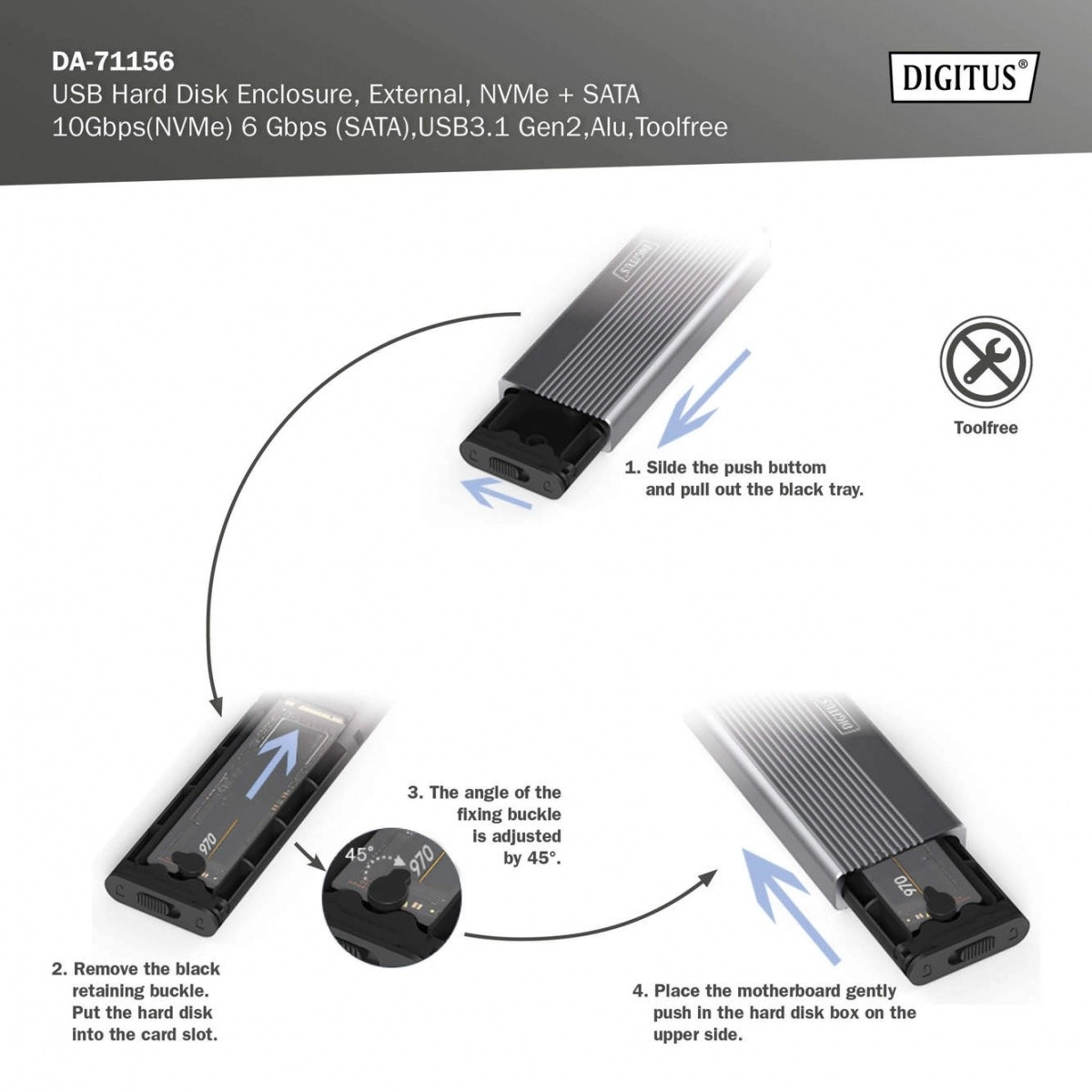 Rozszerz pamięć masową w kilka chwil dzięki kompaktowej i wytrzymałej aluminiowej obudowie (Pantone 430C). Zapewnia szybkie transfery do 10 Gb/s (NVMe) i 6 Gb/s (SATA), jest w pełni plug and play i zasilana bezpośrednio z USB. Konstrukcja beznarzędziowa umożliwia szybką wymianę dysków.