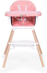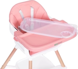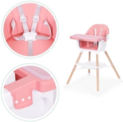 Praktyczne dziecięce krzesełko do karmienia 2 w 1 marki ECOTOYS dla dzieci od 6 do 36 miesięcy, łączące wysokie krzesełko i samodzielną nakładkę na zwykłe krzesło. Oferuje stabilną, metalową konstrukcję, tapicerkę z trwałej i łatwej w czyszczeniu eko-skóry, dwuwarstwową, zdejmowaną tackę do zmywarki, 5‑punktowe pasy bezpieczeństwa, nakładki antypoślizgowe, zabezpieczenie przeciw zsuwaniu oraz praktyczną półkę pod siedziskiem. Maksymalne obciążenie 20 kg.