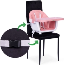 2 sposoby użytkowania – w domu i w podróży: Wysokie krzesełko można w mgnieniu oka zamienić w nakładkę mocowaną do standardowego krzesła. Po zdjęciu nóg siedzisko przymocujesz dołączonymi paskami – idealne rozwiązanie na wakacje, wizyty u rodziny i do małych kuchni.