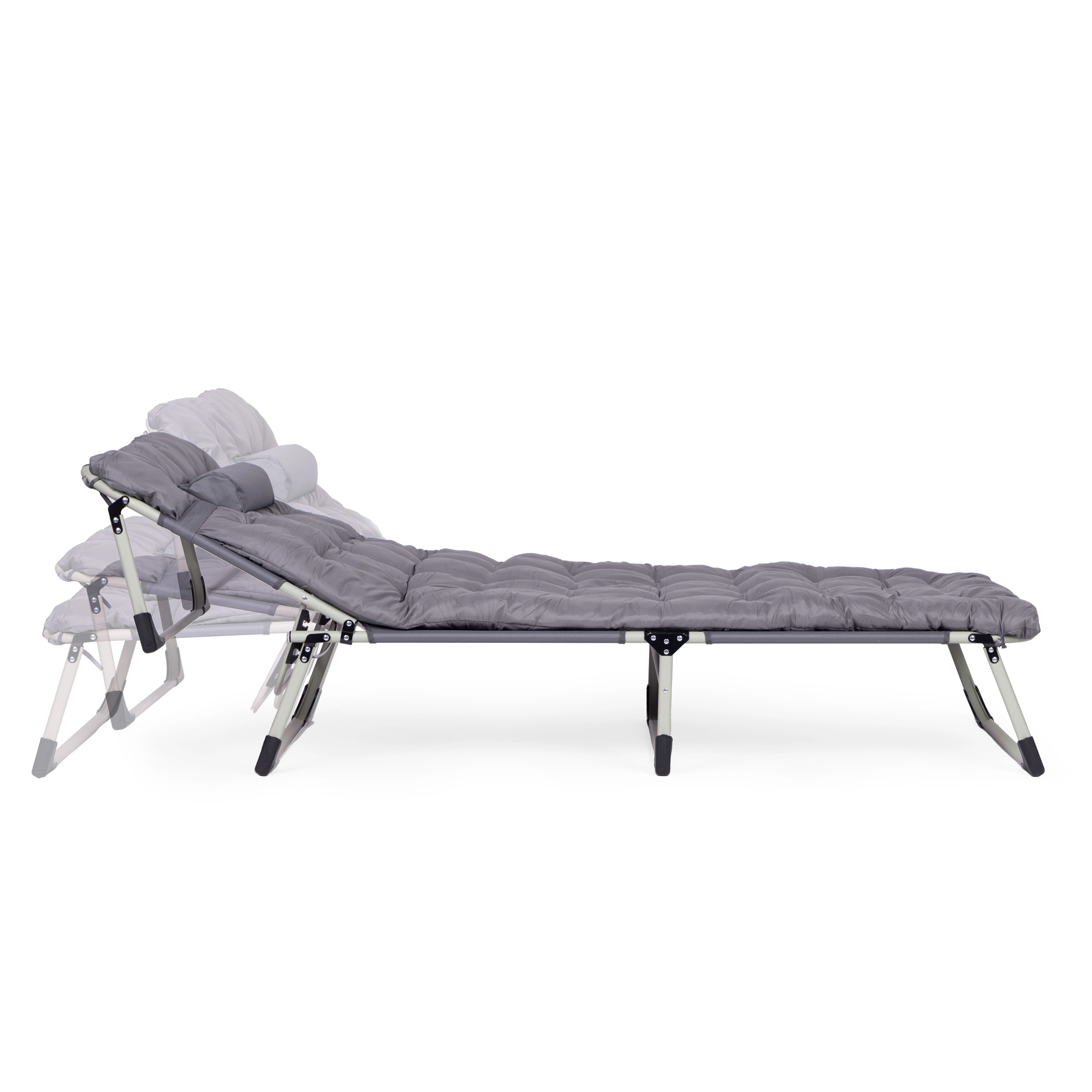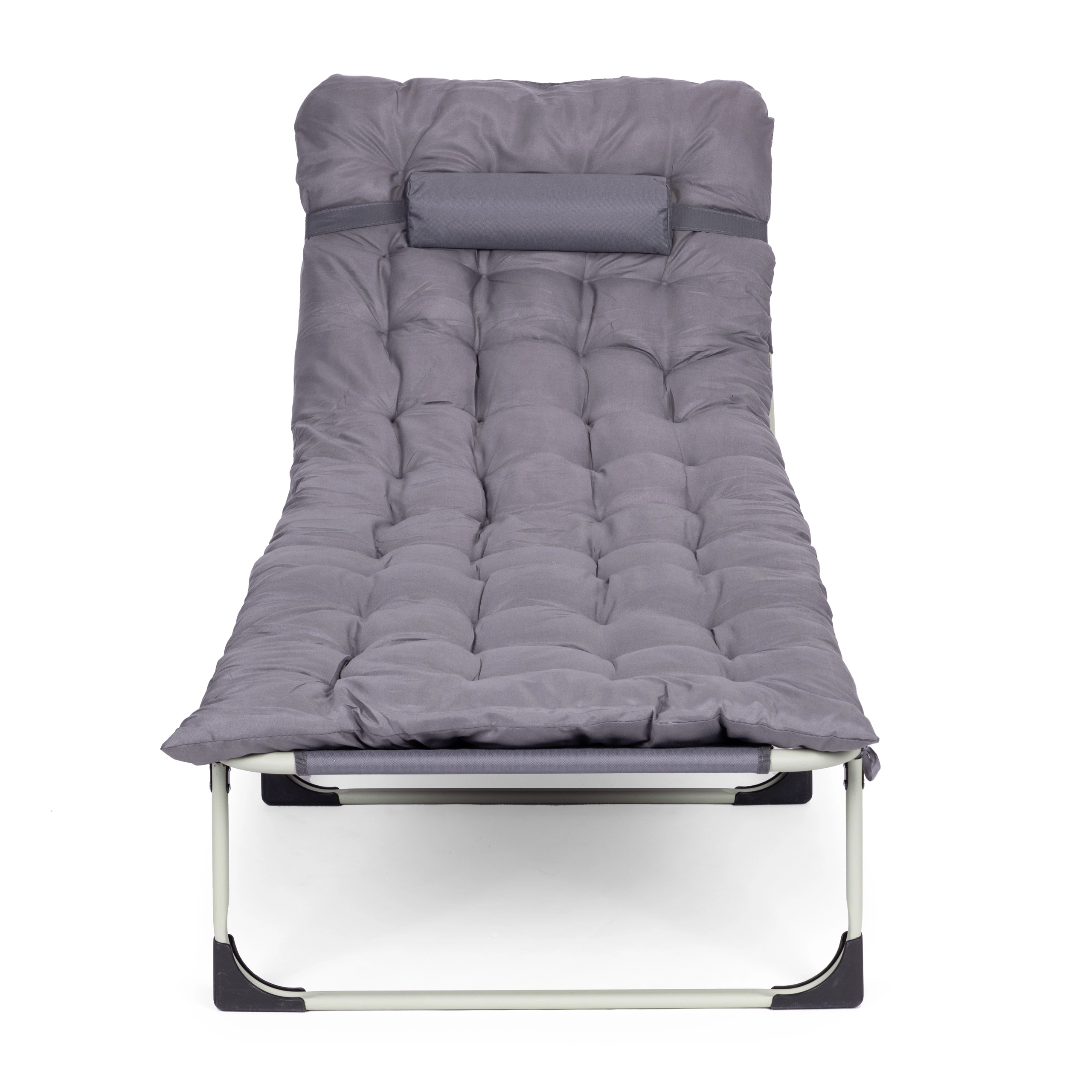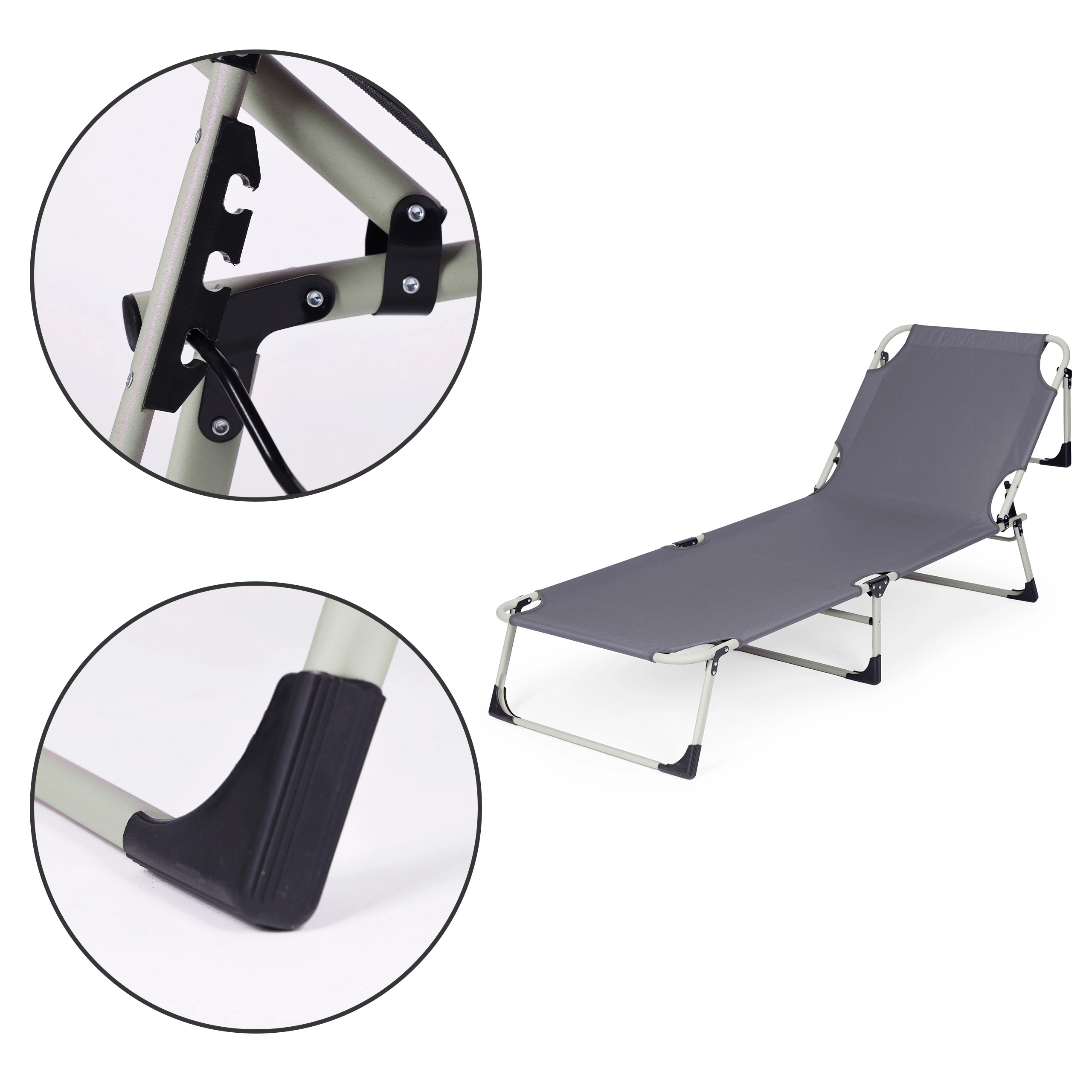 Praktyczny leżak z regulacją w uniwersalnym szarym kolorze stworzony jest do relaksu nad wodą, w ogrodzie i w podróży. Grubo wyściełany materac oraz odpinana poduszka podnoszą komfort przy dłuższym siedzeniu lub leżeniu, a regulowane oparcie pleców w 4 kątach pozwala szybko przejść z pozycji relaksacyjnej do pełnego leżenia.