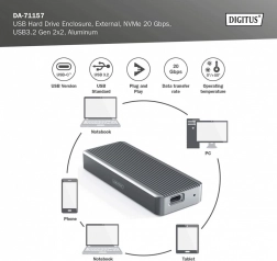 Ta aluminiowa obudowa dla dysków M.2 NVMe to idealny wybór do szybkiej pamięci zewnętrznej. Interfejs USB‑C / USB 3.2 Gen 2x2 zapewnia przepustowość do 20 Gb/s dla błyskawicznego kopiowania dużych plików i płynnej pracy z danymi. Dzięki beznarzędziowej konstrukcji montaż zajmuje chwilę.