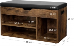 Ławka wyposażona jest w trzy półki - dwie szerokie półki (50,5x13 cm), jedna węższa półka (25x27,5 cm) i dodatkowa przestrzeń pod siedziskiem (80x30 cm). Nowoczesny styl loft dodaje wnętrzu charakteru.