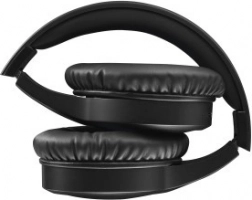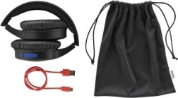 Nowoczesny czarny design uzupełniają niebieskie poduszki nauszne, które nadają unikalny wygląd i zapewniają komfort. W zestawie znajduje się czerwony kabel USB do ładowania oraz czarny woreczek transportowy, co ułatwia korzystanie w podróży.
