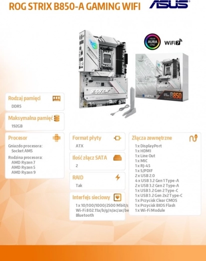 ROG Strix B850-A Gaming WiFi w eleganckim białym wydaniu przenosi Twoje PC na nowy poziom. Płyta jest gotowa na procesory AMD Ryzen serii 9000 i zapewnia najwyższą przepustowość dzięki PCIe 5.0, wysokie częstotliwości pamięci DDR5 oraz ekstremalnie szybkie połączenia przez USB 20 Gb/s i Wi‑Fi 7. To wszystko w solidnej konstrukcji z wzmocnionymi slotami i efektywnym chłodzeniem.