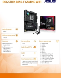 ROG Strix B850-F Gaming WiFi przesuwa granice platformy AMD dzięki topowemu zasilaniu, efektywnemu chłodzeniu i inteligentnym optymalizacjom. Wysoka przepustowość USB, w tym 20 Gb/s, najnowsze Wi‑Fi 7 oraz 2,5Gb Ethernet zapewniają błyskawiczną łączność dla peryferiów, magazynów danych i sieci. Płyta jest gotowa na wymagające zestawy z wieloma dyskami i szybką grafiką, zachowując pożądaną stabilność i niskie temperatury.