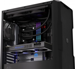 Para 140‑milimetrowych wentylatorów z profilowanymi łopatkami i pofalowaną krawędzią zapewnia znakomity przepływ powietrza przez gęsty radiator przy jednocześnie niskim poziomie hałasu.