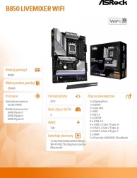 Zrównoważone wyposażenie obejmuje nowoczesne interfejsy USB 3.2, szybkie nośniki M.2 oraz bezprzewodową łączność Wi‑Fi, dzięki czemu łatwo podłączysz peryferia, dyski zewnętrzne, kamery i interfejsy audio. B850 LiveMixer WiFi to niezawodna podstawa dla wydajnego PC do tworzenia treści i grania.