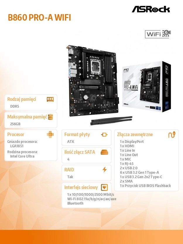 ASRock B860 Pro-A WiFi została zaprojektowana z myślą o stabilności, niezawodności i długiej żywotności. Dzięki wysokiej jakości sekcji zasilania oraz wsparciu najnowszych pamięci DDR5 łatwo uzyskasz wyższą wydajność za pomocą profili Intel XMP / AMD EXPO bez zbędnych komplikacji.