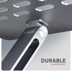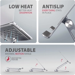 - Lekka i wytrzymała konstrukcja metalowa; powierzchnie antypoślizgowe; wiele pozycji; wysokość do 205 mm; regulacja nachylenia podstawy 180°–90° i ramienia 180°–90°; lepsze odprowadzanie ciepła; łatwe składanie
