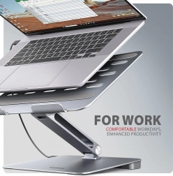 Elegancka i wytrzymała konstrukcja ze stopu aluminium zapewnia pasywne chłodzenie i stabilność, a powierzchnie antypoślizgowe chronią urządzenie przed zarysowaniami. Stojak z podwójnym przegubem umożliwia precyzyjne ustawienie wysokości do 205 mm oraz kąta nachylenia, aby ekran był w jednej linii z monitorem zewnętrznym. Hub rozszerzy Twój laptop o HDMI 4K/60 Hz, 3x USB-A 5Gbps, RJ‑45 Gigabit i wejście USB‑C PD 100 W.