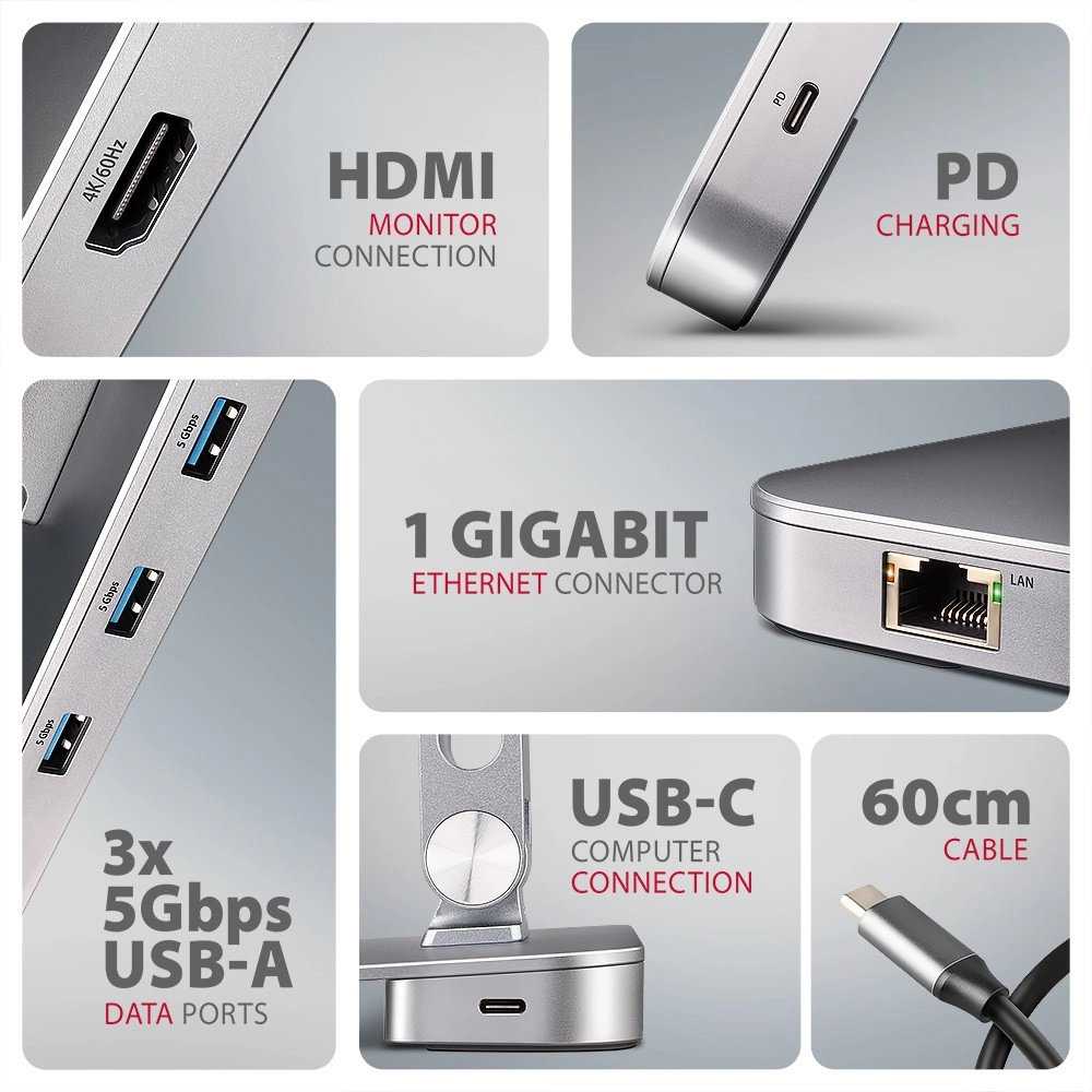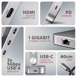 Wyjście HDMI obsługuje do 4K/60 Hz, 2K/120 Hz i 1080p/200 Hz wraz z HDR i dźwiękiem wielokanałowym. USB-A 5Gbps obsłuży dyski zewnętrzne (do dwóch jednocześnie), peryferia oraz ładowanie do 7,5 W. Gigabit Ethernet zapewni stabilne połączenie sieciowe, a przez USB‑C PD 3.0 naładujesz laptop z mocą do 100 W. Podłączenie jest proste dzięki Plug & Play i Hot Plug.