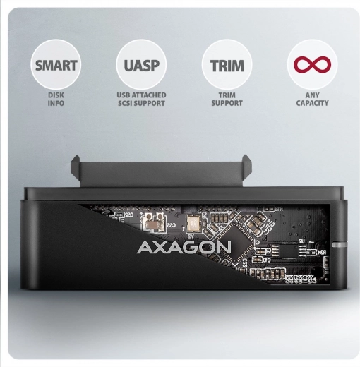 Dla dysków 3.5" w zestawie znajduje się zasilacz AC/DC 12V/2A (24 W), natomiast 2.5" SSD/HDD działają wygodnie z zasilania przez USB. Adapter wspiera nowoczesne technologie dla długiej żywotności i niezawodności: UASP dla szybszych transferów, TRIM dla utrzymania wydajności SSD, S.M.A.R.T. monitoring, możliwość bootowania z podłączonego dysku, Auto Spindown i Turn Off. Matowa powierzchnia jest odporna na odciski, a małe wymiary sprawiają, że adapter zawsze masz pod ręką.