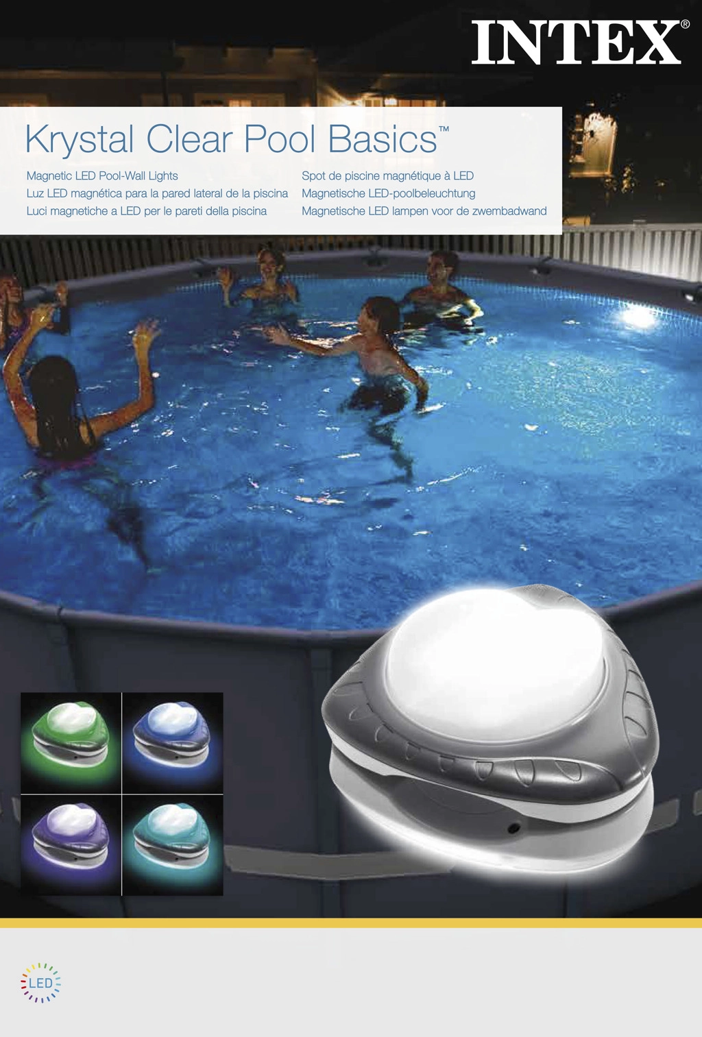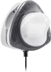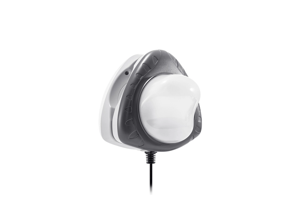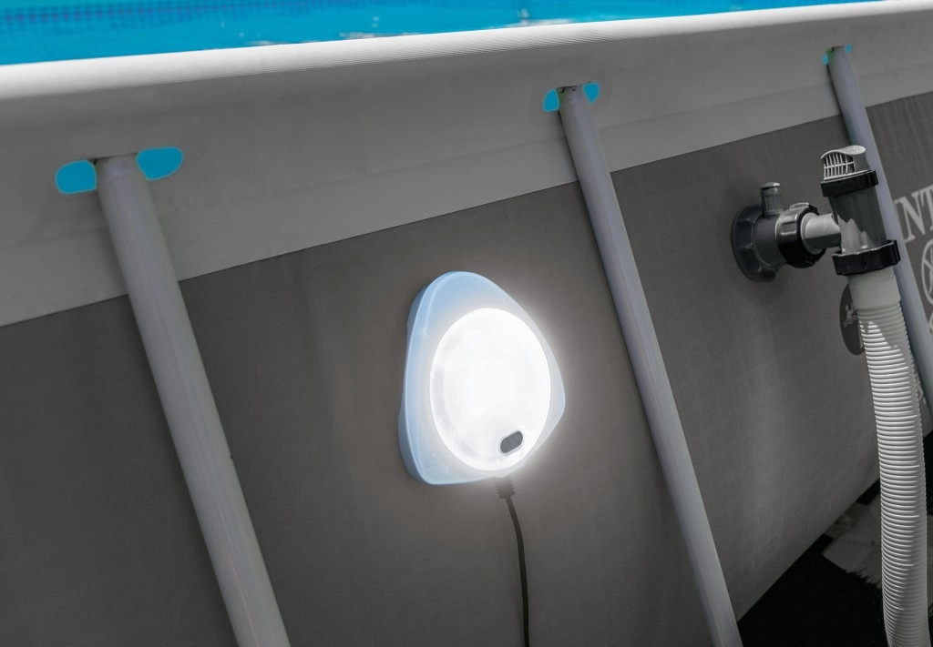 Magnetyczna lampa LED INTEX to sprytne i bezpieczne rozwiązanie do nocnych kąpieli i ogrodowych przyjęć. Dwie połączone części mocuje się po obu stronach ścianki za pomocą mocnych magnesów – część wewnętrzna oświetla wodę, zewnętrzna daje przyjemne, ambientowe światło otoczenia. Dzięki zasilaniu indukcyjnemu wyeliminowano niebezpieczny kontakt prądu z wodą.