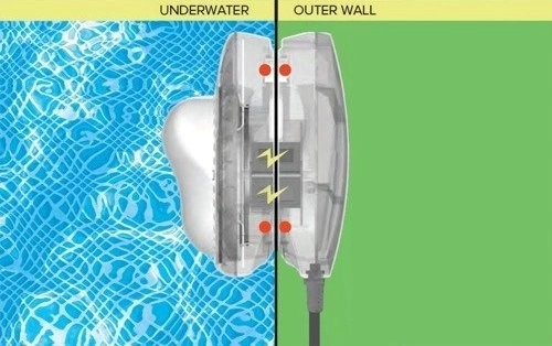 Część wewnętrzna jest zasilana bezprzewodowo przez ściankę basenu. Brak bezpośredniego kontaktu prądu z wodą – maksymalne bezpieczeństwo podczas kąpieli.
