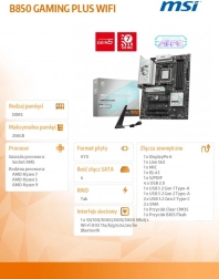 Płyta główna B850 GAMING PLUS WIFI zapewnia topową wydajność dla graczy i twórców: Wi‑Fi 7, 5G LAN, PCIe 5.0, błyskawiczne M.2 Gen5 oraz wytrzymałe zasilanie 12+2+1 dla stabilności podczas podkręcania. Zoptymalizowana pod AMD Ryzen 9000/8000/7000, oferuje łatwy montaż z EZ DIY i wysokiej jakości dźwięk Audio Boost.
