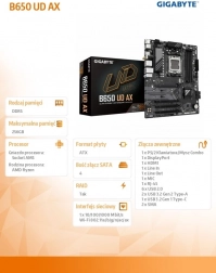 Płyta główna GIGABYTE B650 UD AX dla gniazda AM5 oferuje stabilne zasilanie, wsparcie dla AMD Ryzen 7000/8000/9000, szybką pamięć DDR5 oraz błyskawiczne magazyny M.2 PCIe 5.0/4.0. Zapewnia także Wi‑Fi 6, GbE LAN, nowoczesną łączność HDMI/DP i USB 10 Gb/s oraz przydatne funkcje, takie jak EZ‑Latch, Q‑Flash Plus i Smart Fan 6 dla łatwego montażu i niezawodnej pracy.