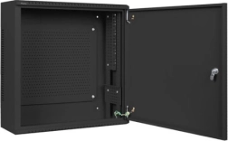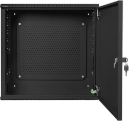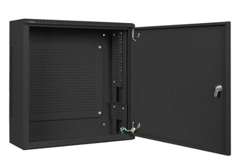 Szafa dostarczana jest zmontowana, z zamykanymi drzwiami dla bezpiecznego przechowywania urządzeń sieciowych i CCTV. Montaż na ścianie jest szybki i pewny dzięki otworom pod wkręty.