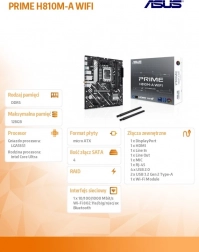 Płyta główna PRIME H810M-A WiFi to idealny wybór do każdej obudowy mATX dzięki wymiarom 24,4 x 22,2 cm, co zapewnia optymalne wykorzystanie przestrzeni. Kluczowym elementem jest podstawka LGA1851, obsługująca procesory z rodziny Intel Core Ultra, co pozwala cieszyć się wyjątkową mocą i szybkością komputera.