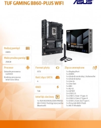 Płyta główna Asus TUF Gaming B860-PLUS WIFI jest idealnym rozwiązaniem dla graczy i użytkowników wymagających nowoczesnych technologii. Wyposażona w gniazdo LGA1851, wspiera procesory Intel Core Ultra dla niezrównanej wydajności i płynności. Chipset Intel B860 zapewnia stabilną pracę nawet przy intensywnym użyciu.