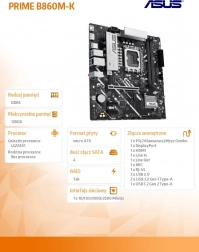ASUS PRIME B860M-K łączy wysoką jakość wykonania, najnowszy chipset Intel B860 oraz obsługę pamięci DDR5 dla doskonałej responsywności systemu. Dzięki gniazdu LGA1851 jest gotowa na nowoczesne procesory Intel i oferuje zrównoważony stosunek wydajności, łączności i niezawodności w kompaktowym formacie microATX.