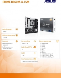 Płyta główna ASUS Prime B860M-A CSM zapewnia niezawodną wydajność dla procesorów Intel Core Ultra oraz nowoczesne wyposażenie do szybkich i stabilnych zestawów. Dzięki chipsetowi Intel B860, obsłudze DDR5 do 256 GB i interfejsom PCIe 5.0/4.0 oferuje świetną przepustowość, możliwości rozbudowy i długą żywotność w kompaktowym formacie microATX 24,4 × 24,4 cm.