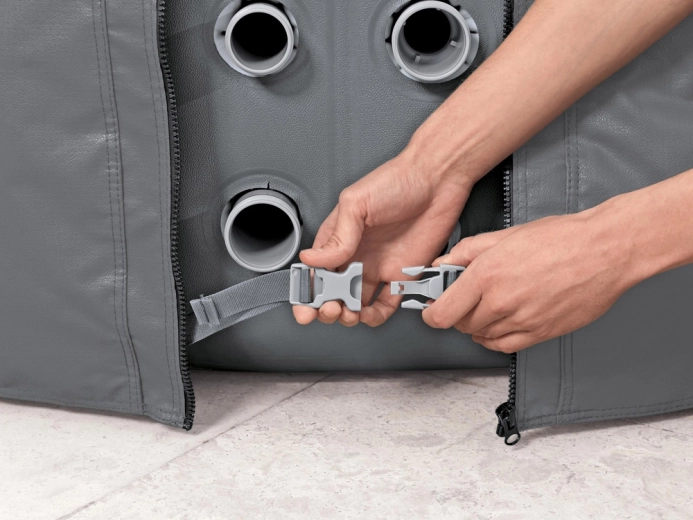 Regulowany pas z klamrami zapewnia idealne dopasowanie, a zamek błyskawiczny umożliwia podłączenie wbudowanej i zewnętrznej pompy bez zdejmowania pokrywy.