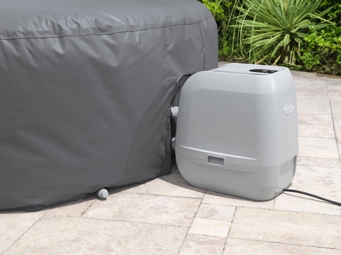 Montaż jest szybki i intuicyjny. Regulowany pas obwodowy z zabezpieczającymi klipsami gwarantuje pewne mocowanie, a zintegrowany zamek błyskawiczny umożliwia bezproblemowe podłączenie pompy bez konieczności zdejmowania pokrywy. Pokrywa jest kompatybilna z modelami Lay‑Z‑Spa St. Moritz, Monaco, Santorini HydroJet Pro oraz innymi okrągłymi wannami o średnicy 216 cm.