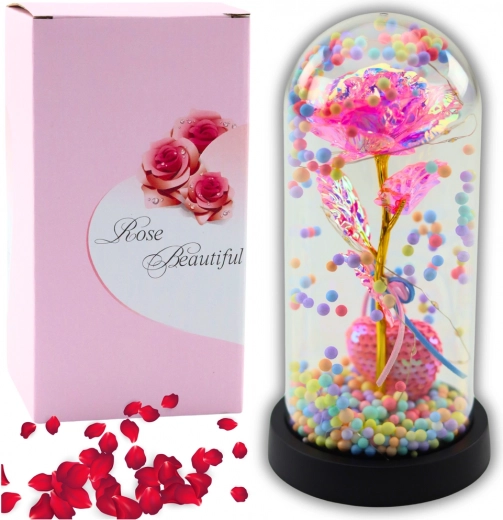 Elegancka dekoracja i romantyczny prezent w jednym: różowa wieczna róża w przezroczystej kopule z delikatnym oświetleniem LED, uzupełniona o serduszko i kolorowe kuleczki. Nie wymaga żadnej pielęgnacji, a mimo to zachowuje swoje trwałe piękno i tworzy przytulną atmosferę w każdym wnętrzu.