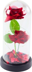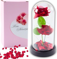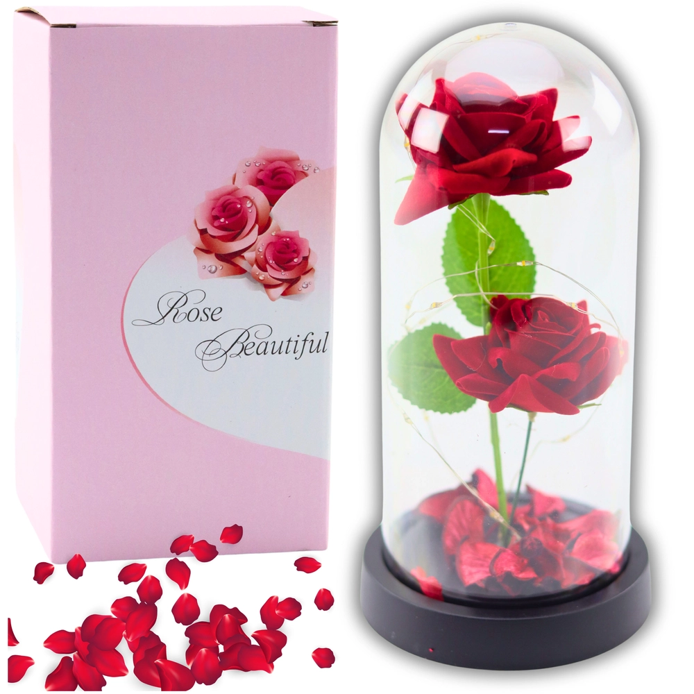 Wieczne róże w kopule z oświetleniem LED i płatkami róż – czerwone to elegancki i symboliczny prezent, który wyrazi Twoje uczucia i doda niepowtarzalnego charakteru każdemu wnętrzu. Wewnątrz kopuły znajdują się dwie sztuczne róże i płatki, które w połączeniu z delikatnym oświetleniem LED tworzą wyjątkową atmosferę, idealną na romantyczne okazje.