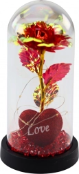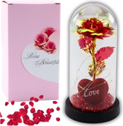 Wieczna róża w czerwonym kolorze z serduszkiem i napisem "LOVE", umieszczona w eleganckiej kopule z delikatnym oświetleniem LED, oferuje unikalny i symboliczny prezent. Dzięki ozdobnym czerwonym koralikom tworzy niesamowity efekt wizualny, idealny na romantyczne okazje.