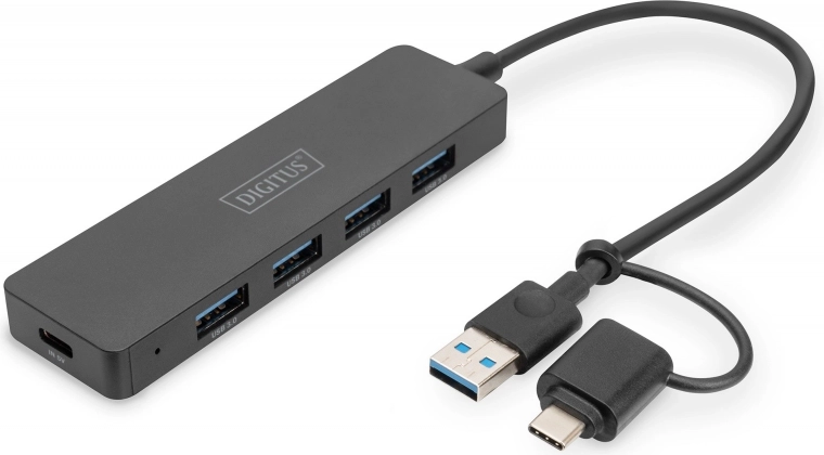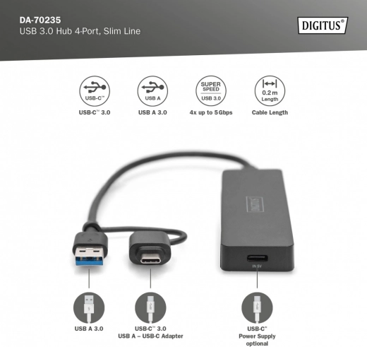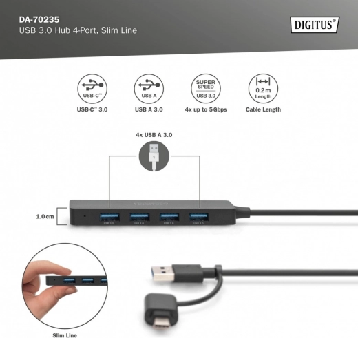 USB Hub 3.0 DIGITUS Slim Line to idealne rozwiązanie do rozszerzenia łączności w każdym miejscu pracy. Ten hub pozwala podłączyć do czterech urządzeń USB i korzystać z nich jednocześnie. Umożliwia wygodne używanie wielu urządzeń do sterowania lub przechowywania danych. Dzięki technologii USB 3.0 transfer danych może osiągać prędkości do 5 Gbps, co gwarantuje szybki przesył danych. Smukła konstrukcja sprawia, że ten 4‑portowy hub jest idealnym towarzyszem w podróży, a także niezbędnym w domu i biurze.