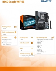 Zbuduj wydajny i niezawodny komputer na platformie Gigabyte B860 Eagle Wi‑Fi 6E. Płyta wspiera najnowsze procesory Intel Core Ultra (2. generacja), dwukanałowe moduły DDR5 z profilami XMP i oferuje solidne zasilanie VRM Digital Twin 12+1+2 dla stabilnej pracy nawet pod dużym obciążeniem.