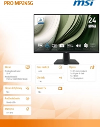 Płaski monitor MSI 23,8″ z panelem LED, rozdzielczością Full HD i płynnym odświeżaniem 100 Hz to świetny wybór do pracy i rozrywki. Oferuje ostry obraz, energooszczędne działanie oraz uniwersalne czarne wykończenie pasujące do każdego otoczenia.