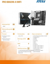 MSI PRO B860M-A WIFI to uniwersalna płyta mATX zaprojektowana z myślą o niezawodności, efektywności i długiej żywotności. 12+1+1+1‑fazowe zasilanie z 8+4‑pinowym zasilaniem CPU, 6‑warstwowe PCB z materiałów klasy serwerowej oraz technologie Core Boost i Memory Boost zapewniają stabilną pracę najnowszych procesorów Intel Core Ultra i wysokie częstotliwości DDR5. Rozszerzony radiator z Frozr Guard, podkładki termiczne 7 W/mK oraz osłona EZ M.2 Shield Frozr II utrzymują temperatury pod kontrolą nawet przy długotrwałym obciążeniu.
