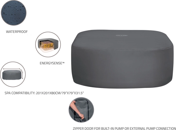 Wykonana z trwałego i wodoodpornego materiału DuraPlus™, zapewnia długą żywotność i ochronę przed niekorzystnymi warunkami pogodowymi. Wyposażona w zamek błyskawiczny do łatwego podłączenia pompy, co ułatwia użytkowanie bez potrzeby zdejmowania pokrywy.
