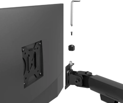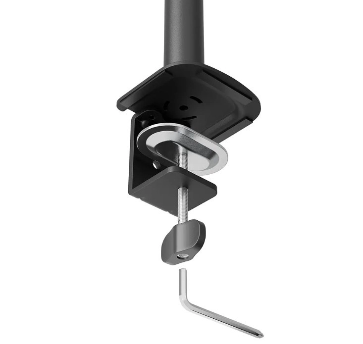 Uchwyt jest zgodny ze standardami VESA 75x75 mm i 100x100 mm, z możliwością rozszerzenia przy użyciu opcjonalnych adapterów VESA dla niestandardowych rozwiązań. Zintegrowany system zarządzania przewodami zapewnia estetyczne i funkcjonalne prowadzenie kabli, pomagając utrzymać porządek na biurku.