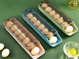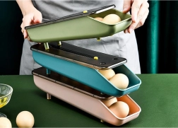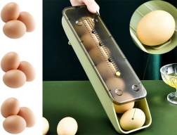 Koniec z niestabilnymi pudełkami i stłuczonymi jajkami. Ten sprytny zasobnik na jajka z przesuwną pokrywką utrzymuje jajka bezpiecznie na miejscu, a dzięki nachyleniu po wyjęciu jednego sztuka automatycznie przesuwa się do przodu. Zintegrowany suwak daty pozwala oznaczyć dzień włożenia lub zużycia, dzięki czemu świeżość masz zawsze pod kontrolą.