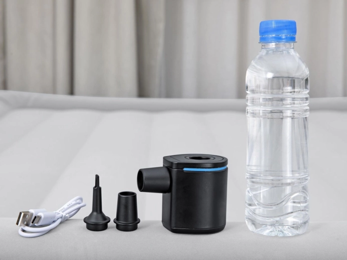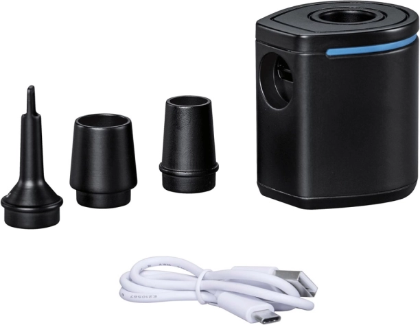 Dzięki przepływowi 90 l/min pompka szybko poradzi sobie z pompowaniem i wypompowywaniem. Obsługa jest intuicyjna — wystarczy jeden przycisk. Z trzema nasadkami pasuje do większości standardowych zaworów w materacach, kołach, leżakach i karimatach kempingowych.