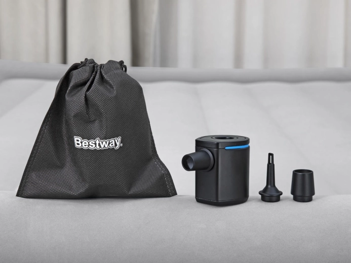 Kompaktowa i lekka USB elektryczna pompka BESTWAY POWERTOUCH POCKET do szybkiego pompowania i wypompowywania materacy, karimat kempingowych oraz zabawek basenowych. Dzięki wydajności 90 l/min, prostemu sterowaniu jednym przyciskiem i ultralekkiej konstrukcji (68 g) jest idealna na podróże i biwak. W zestawie znajdują się 3 uniwersalne nasadki oraz kabel USB.