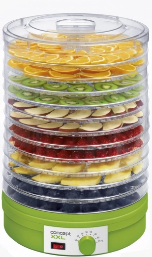 Suszarka do żywności Concept oferuje świetne rozwiązanie, aby wydłużyć trwałość żywności bez utraty jej wartości odżywczych. Rozmiar XXL z 12 sitami pozwala przygotować duże zapasy suszonych warzyw i owoców na zimę. W efekcie otrzymasz smaczne zupy lub zdrowe kompoty, które ucieszą całą rodzinę. Łatwa pielęgnacja – suszarka została zaprojektowana tak, aby jej czyszczenie było jak najwygodniejsze, sita można myć w zmywarce. Równomierne suszenie zapewnia zintegrowany wentylator ze specjalnie ukształtowanymi otworami wentylacyjnymi, które gwarantują doskonałe rezultaty na każdym poziomie suszarki.