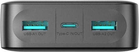 Posiada trzy porty ładowania – dwa USB-A i jeden Type-C, co umożliwia zasilanie aż trzech urządzeń naraz.