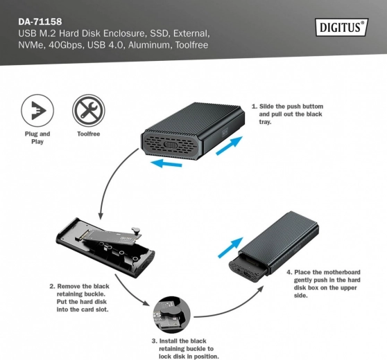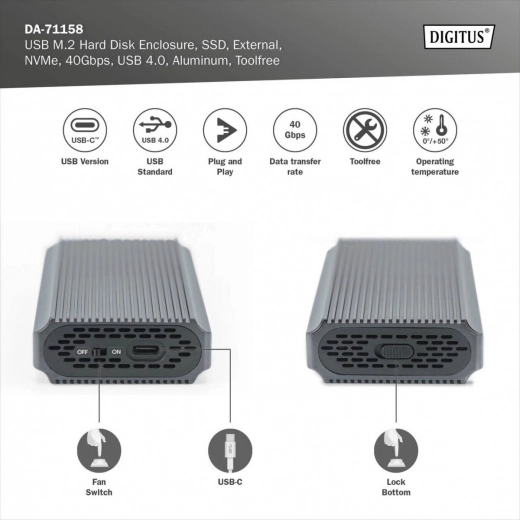 Obudowa do dysków zapewnia wysoką kompatybilność z modułami M.2 w różnych formatach (2230, 2242, 2260 i 2280) oraz maksymalną pojemność 8 TB, co gwarantuje wystarczająco dużo miejsca na wszystkie pliki i dane. Dzięki technologii USB 4.0 zapewniony jest szybki transfer danych z prędkością 40 Gb/s, co oznacza płynną pracę i efektywne przesyłanie plików.